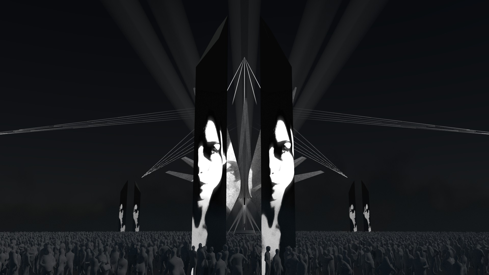Across the monument’s surfaces, Forest Swords’ “Hood” unfolds through density, shadow, and low-frequency movement. A sense of weight and gravity is articulated through particle systems embedded within the structure, suggesting mass suspended in tension. Lighting and content pulse and destabilise in response to the music, shifting between order and disorder within the monument’s concrete confines.